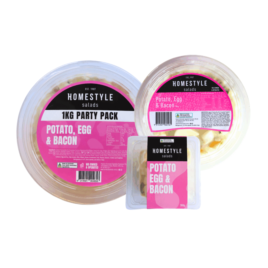 INGREDIENTS: Cooked Potatoes (56.5%), Salad Dressing (Water, Canola Oil, Sugar, Vinegar, Salt, Vegetable Gums (Xanthan, Guar), Skim Milk Powder), Water, Boiled Egg (10%), Bacon (3%) (Pork (96%), Water, Salt, Dextrose, Mineral Salts (450, 451, 452), Antioxidant (316), Preservative (250)), Spring Onion, Parsley
