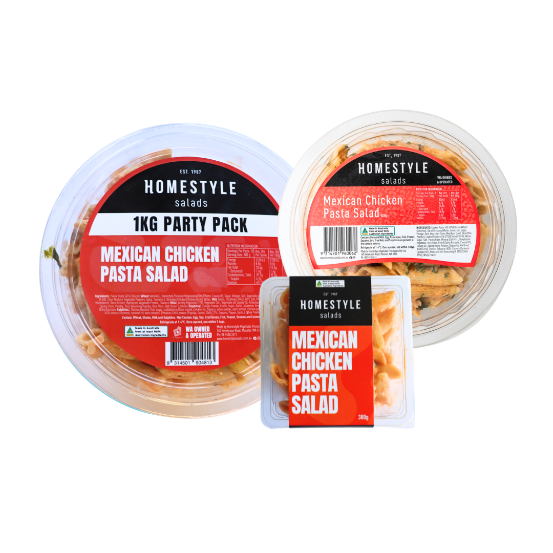 INGREDIENTS: Cooked Pasta (45.50%)(Durum Wheat Semolina), Salad Dressing (Water, Canola Oil, Sugar, Vinegar, Salt, Vegetable Gums (Xanthan, Guar), Skim Milk Powder), Cooked Chicken (16.07%)(Chicken (96%), Water, Sugar, Salt, Potato Fibre, Mineral Salt (451), Dehydrated Vegetable, Rice Flour, Herb & Spice Extracts, Canola Oil), Canola Oil, Spring Onion, Parsley, Seasoning Mix (Food Acid (Citric), Flavour Enhancer (635), Colours (Turmeric, Caramel IV)), Mexican Chilli Seasoning (0.18%) (Chilli 17%)), Whey Powder
