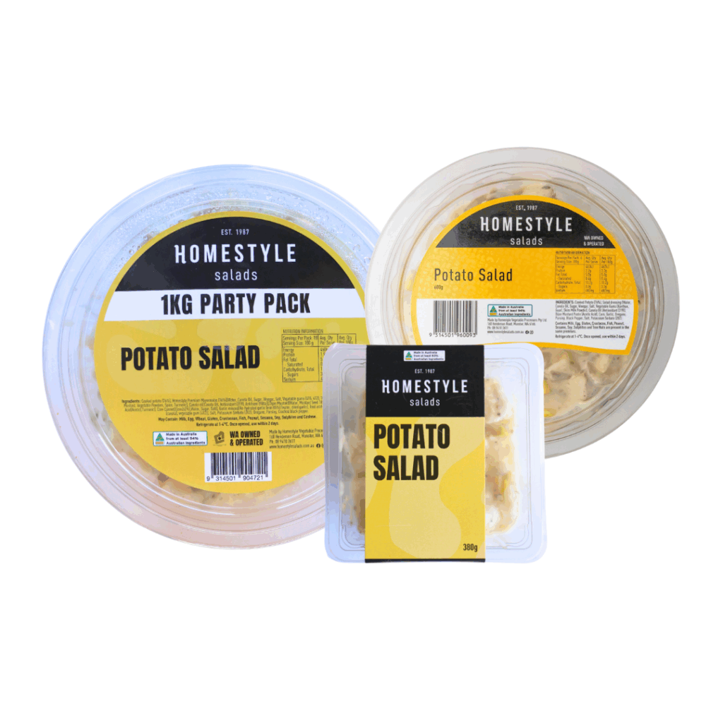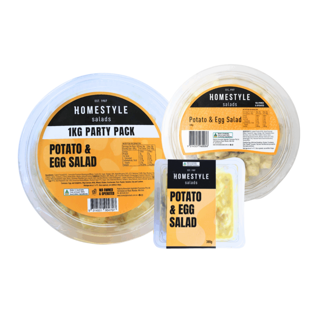 INGREDIENTS: Cooked Potato (65%), Salad Dressing (Water, Canola Oil, Sugar, Vinegar, Salt, Vegetable Gums (Xanthan, Guar), Skim Milk Powder), Celery, Onion, Gherkin Spread (Cornstarch, Natural Colours (141,101)), Boiled Egg (2.4%), Mustard Paste (Food Acid (Acetic)), Spring Onion