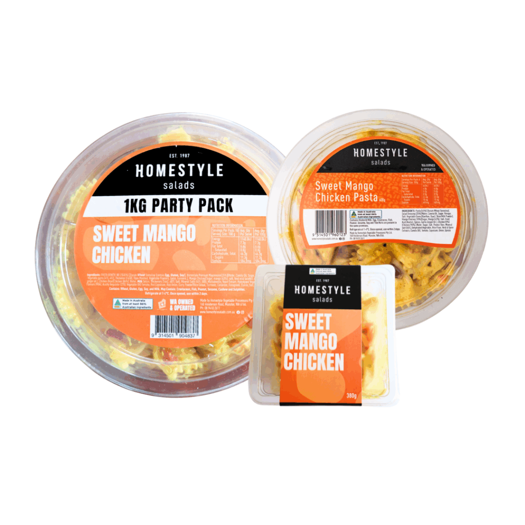 INGREDIENTS: Pasta (45%) (Durum Wheat Semolina), Salad Dressing (25%)(Water, Canola Oil, Sugar, Vinegar, Salt, Vegetable Gums (Xanthan, Guar), Skim Milk Powder ), Mango Chutney (10%)(Sugar, Mango (43%), Salt, Food Acid (Acetic), Spices, Garlic,Ginger Oil ), Chicken (9%)(Chicken (96%), Water, Sugar, Salt, Potato Fibre, Mineral Salt (451), Dehydrated Vegetable, Rice Flour, Herb & Spice Extracts, Canola Oil), Tomato, Capsicum, Onion, Spices